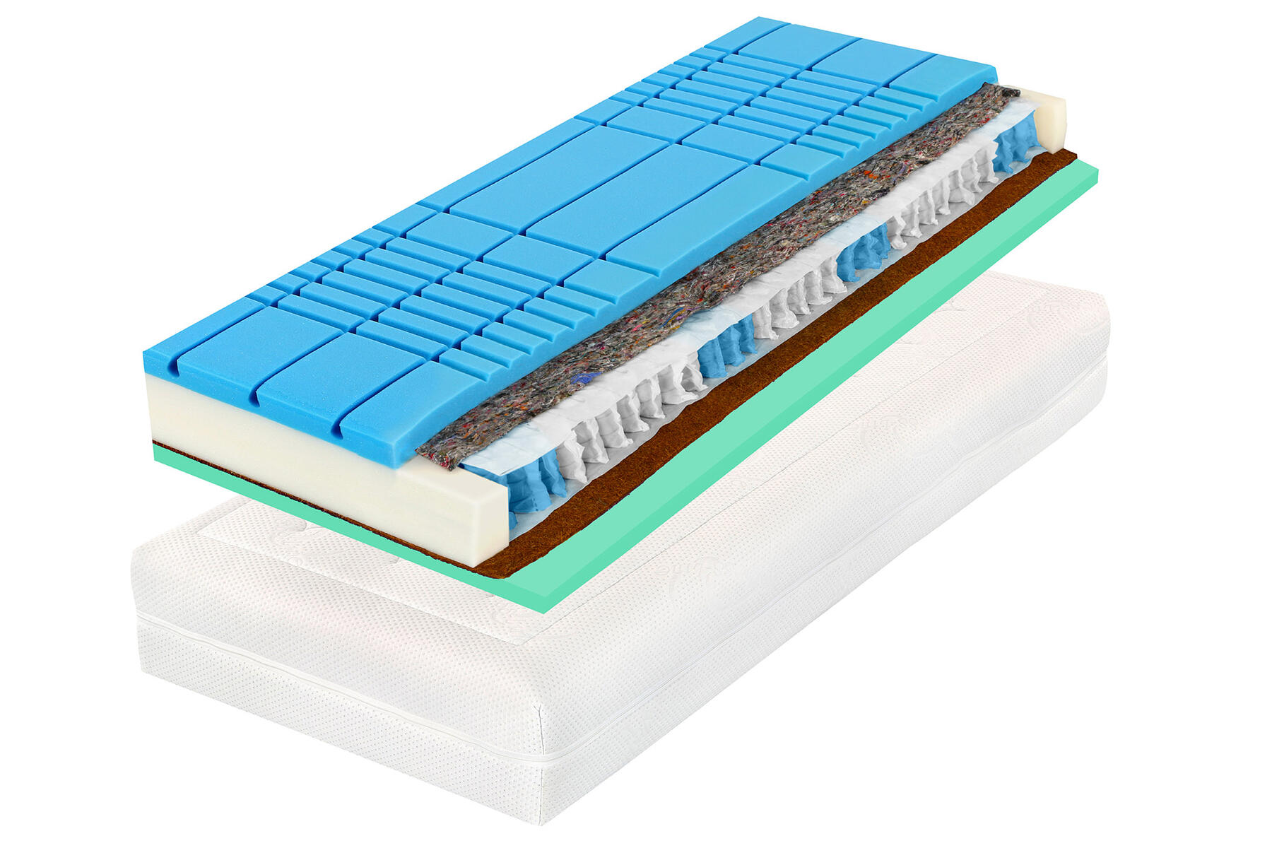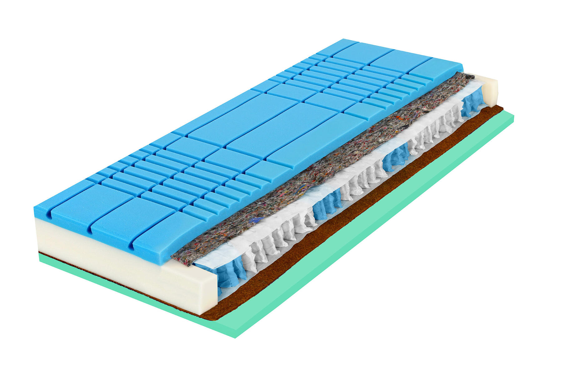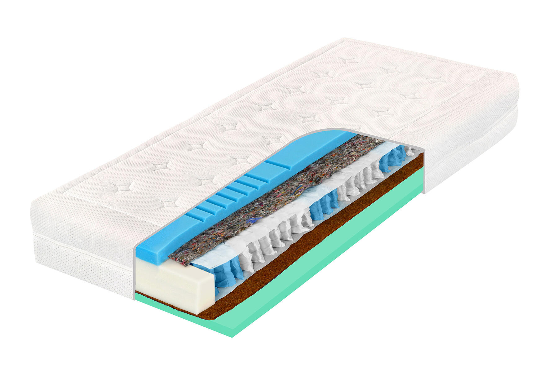 ZÓNOVÉ ORTOPEDICKÉ JADRO: 7 anatomických zón, cca 400 samostatne reagujúcich pružiniek z českej pružinovej ocele podopiera a kopíruje telo v každej polohe. Robustný penový rám na stabilitu konštrukcie a pohodlné vstávanie. Objemové hmotnosti pien 28 - 30 kg/m3 pre vysokú mechanickú i hygienickú životnosť a odolnosť.