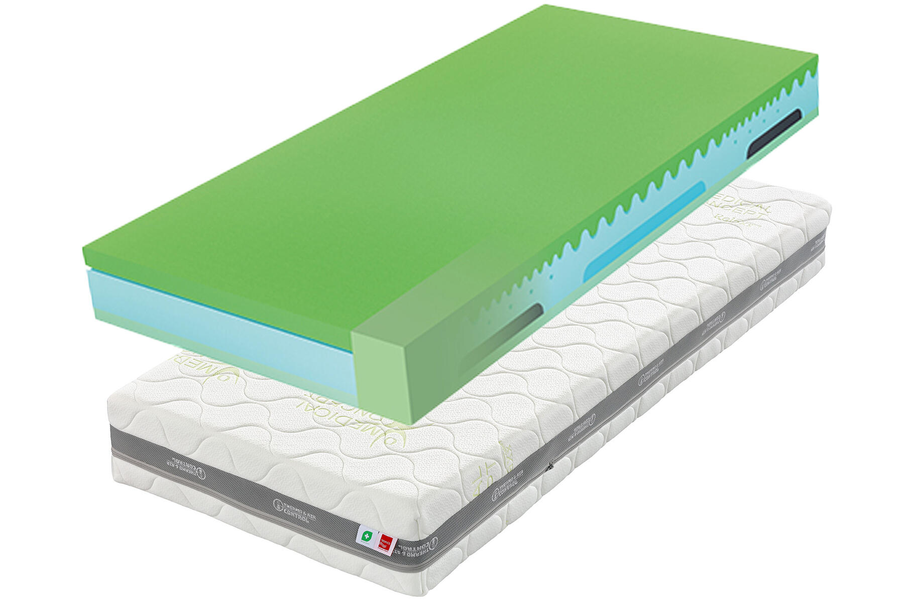 - Citlivé výstuhy v oblasti panvy a ramien. Ramenné zóny citlivo upravujú tuhosti, čo oceníte najmä počas spánku na boku. V oblasti panvy je odolná studená pena veľmi vysokej objemovej hmotnosti. Je zároveň šetrná k bedrovým kĺbom.